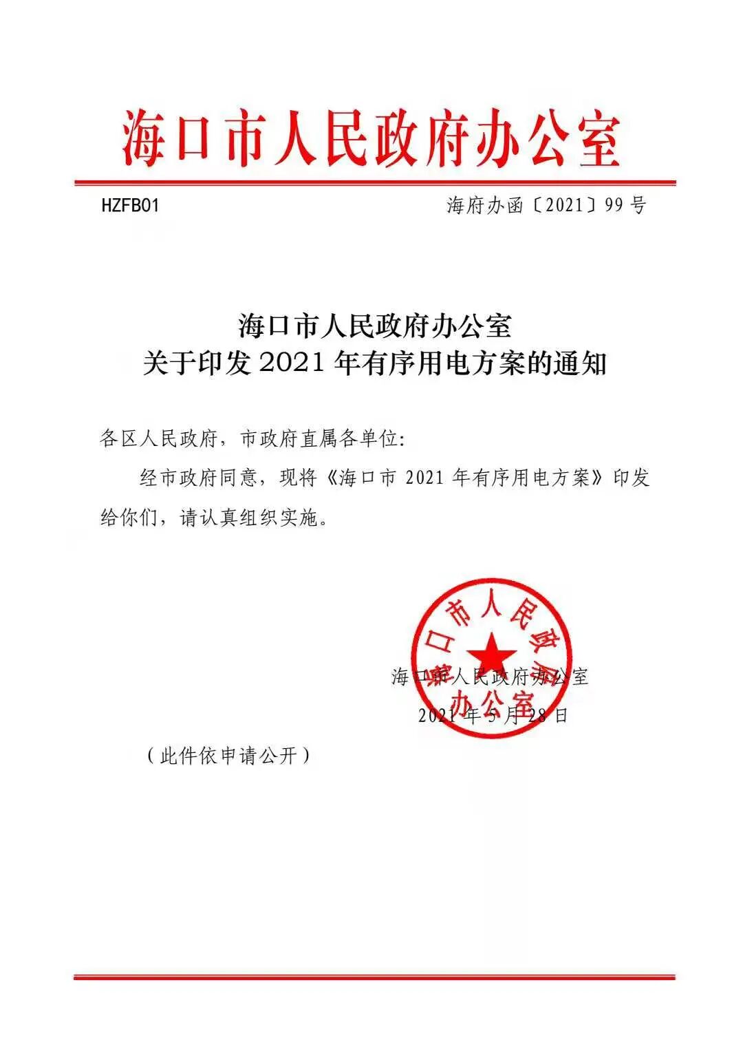 海口市人民政府办公室关于印发2021年有序用电方案的通知