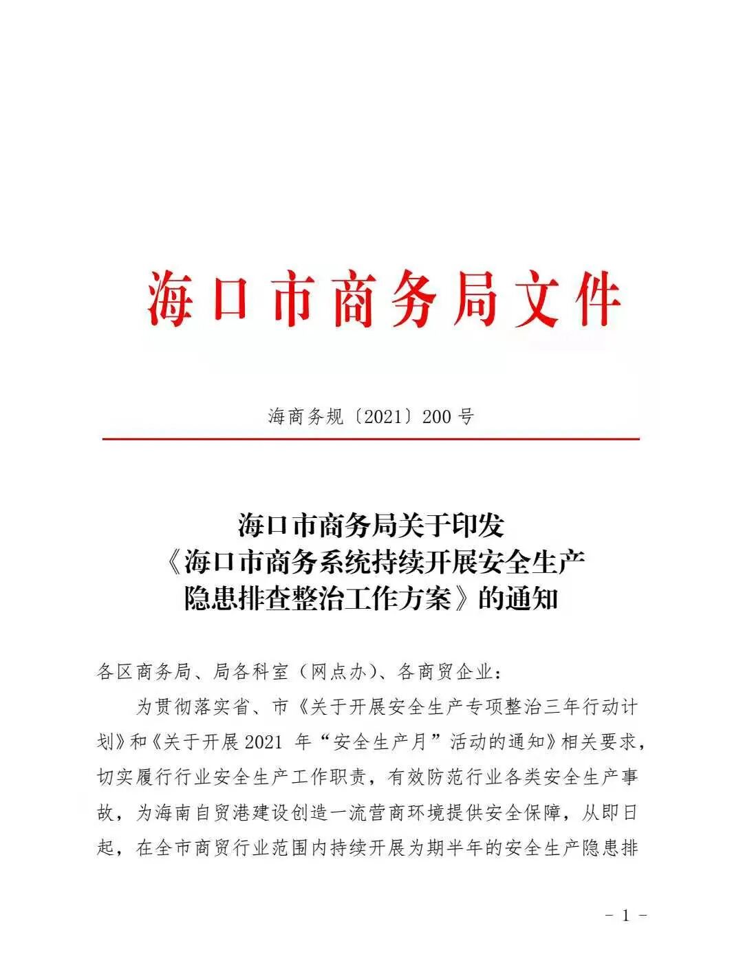 海口市商务局关于印发《海口市商务系统持续开展安全生产隐患排查整治工作方案》的通知