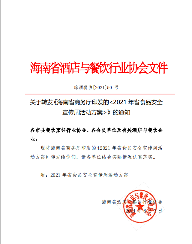 关于转发海南省商务厅2021年省食品安全宣传周活动方案