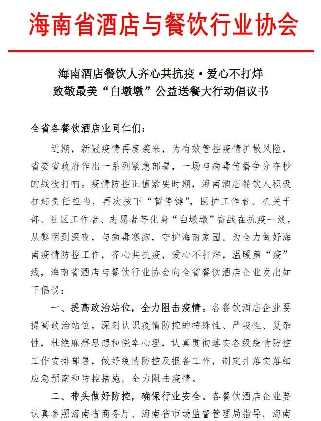 2024.03.07 12:27海南酒店餐饮人齐心共抗疫•爱心不打烊\n致敬最美“白墩墩”公益送餐大行动倡议书
