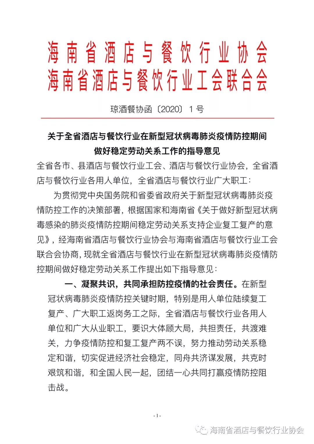 关于全省酒店与餐饮行业在新型冠状病毒肺炎疫情防控期间做好稳定劳动关系工作的指导意见