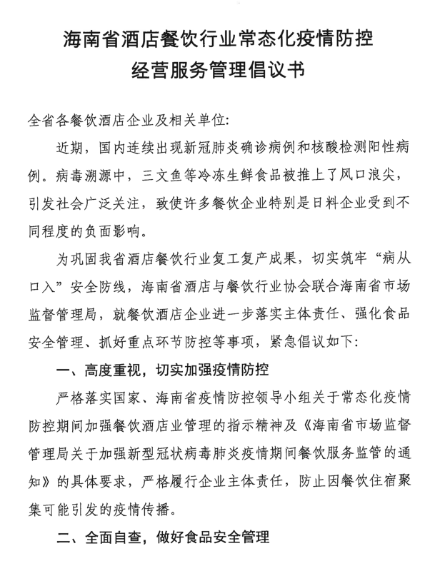 海南省酒店与餐饮行业协会联合省市场监督管理局就常态化疫情防控经营服务管理 发出紧急倡议