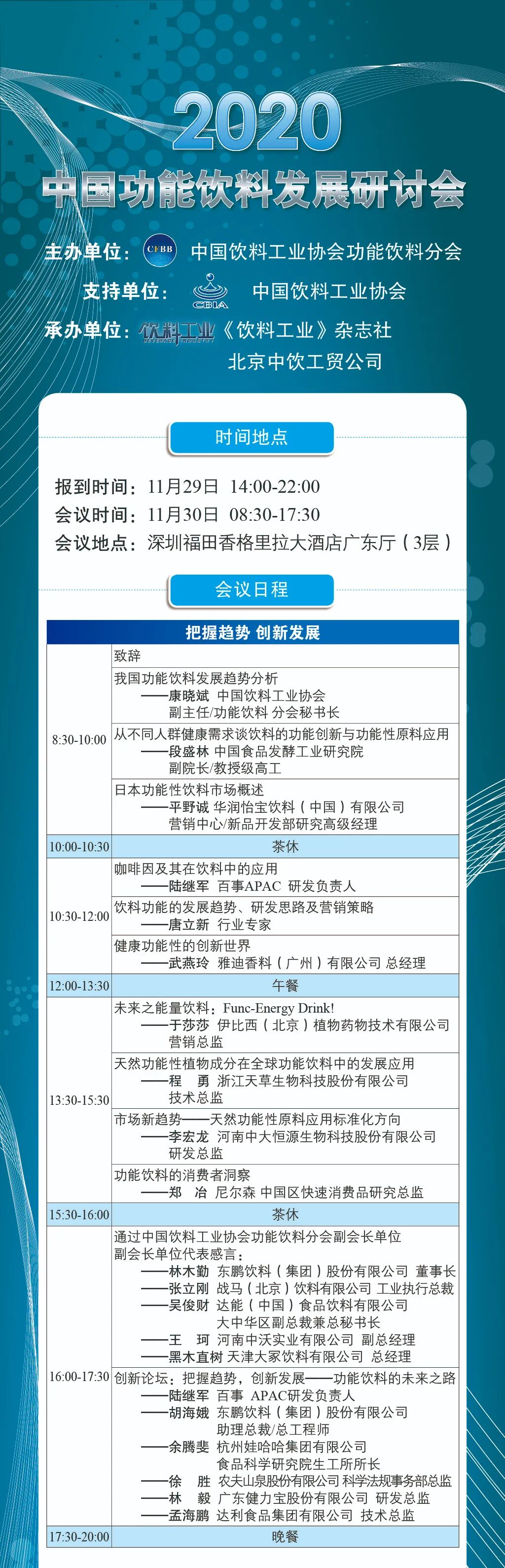 “2020中国功能饮料发展研讨会”将于11月30日在深圳召开,本次大会以“把握趋...