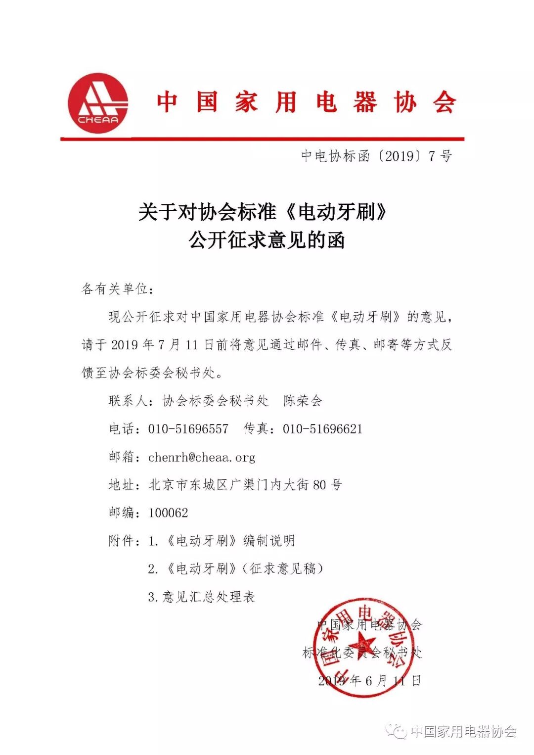现公开征求对中国家用电器协会标准《电动牙刷》的意见,请于2019年7月11日前将...