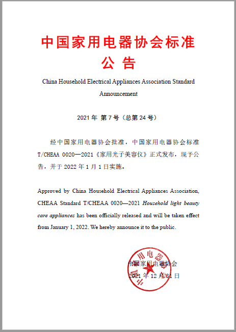 中国家用电器协会标准公告2021年第7号《家用光子美容仪》正式发布