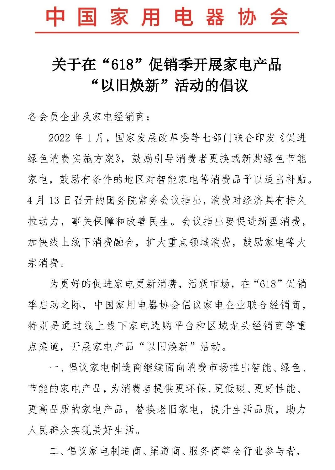 中国家用电器协会发出关于在“618”促销季开展家电产品“以旧焕新”活动的倡议