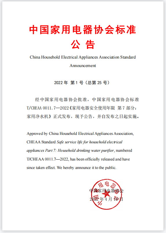 【CHEAA团体标准】《家用电器安全使用年限 第7部分:家用净水机》正式发布