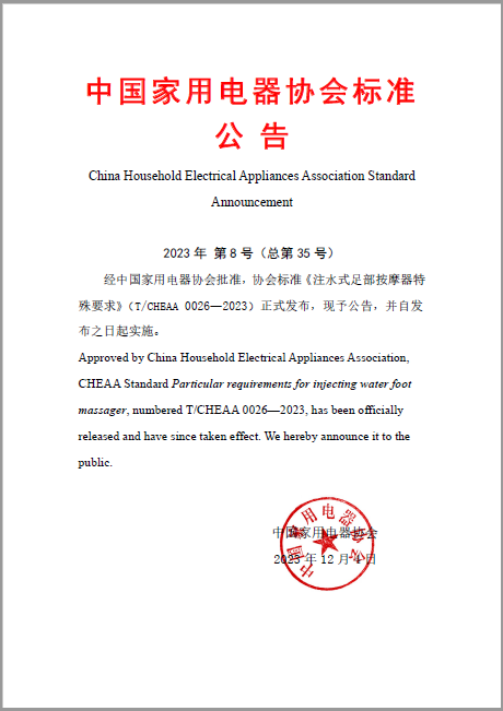 经中国家用电器协会批准,协会标准《注水式足部按摩器特殊要求》(T/CHEAA 0...