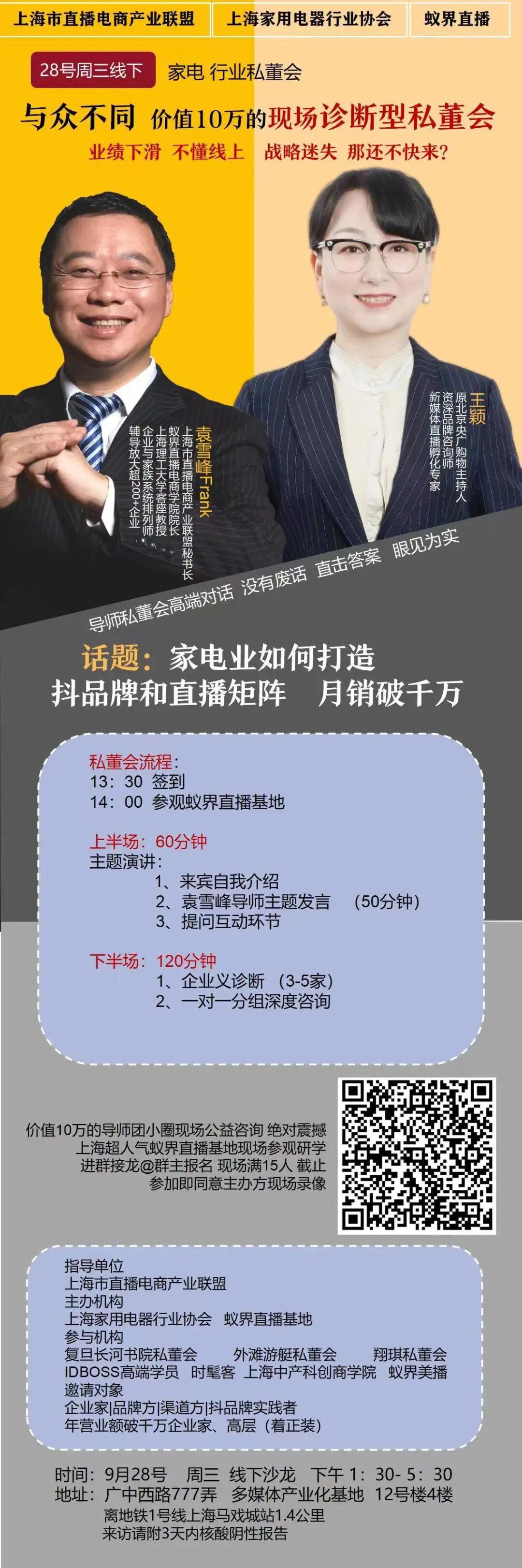 9月28日,由上海家用电器行业协会、蚁界直播基地主办的直播私董会在广中西路777...