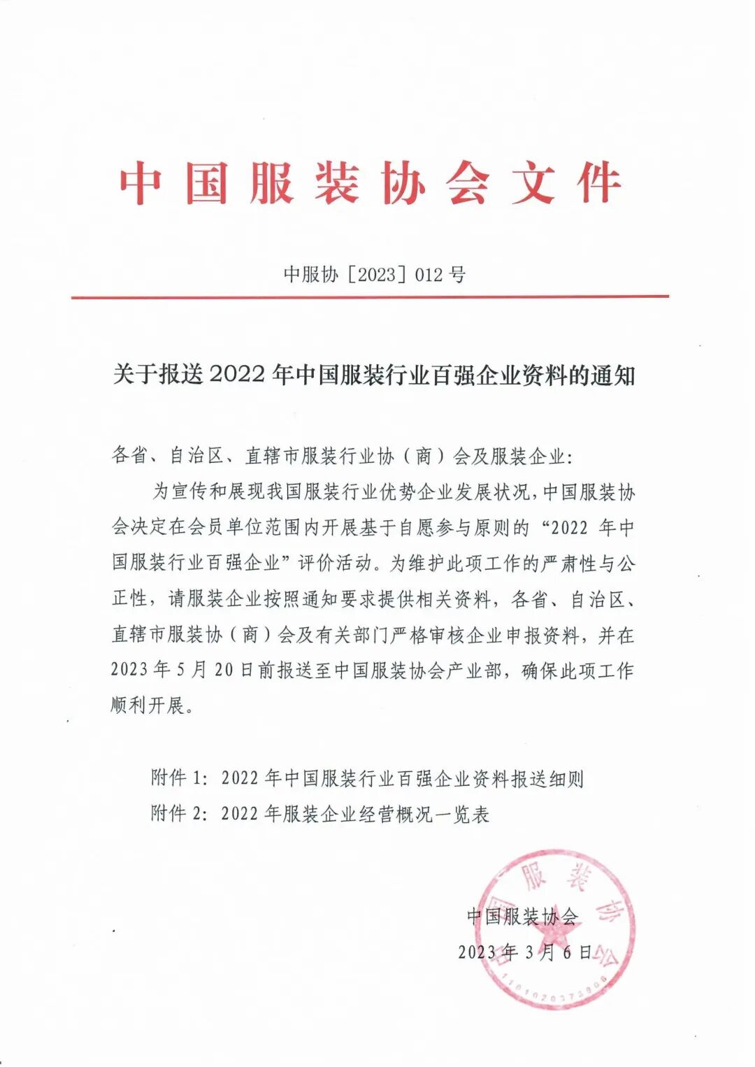 2024.03.13 10:22关于报送2022年全国服装行业百强企业资料的通知