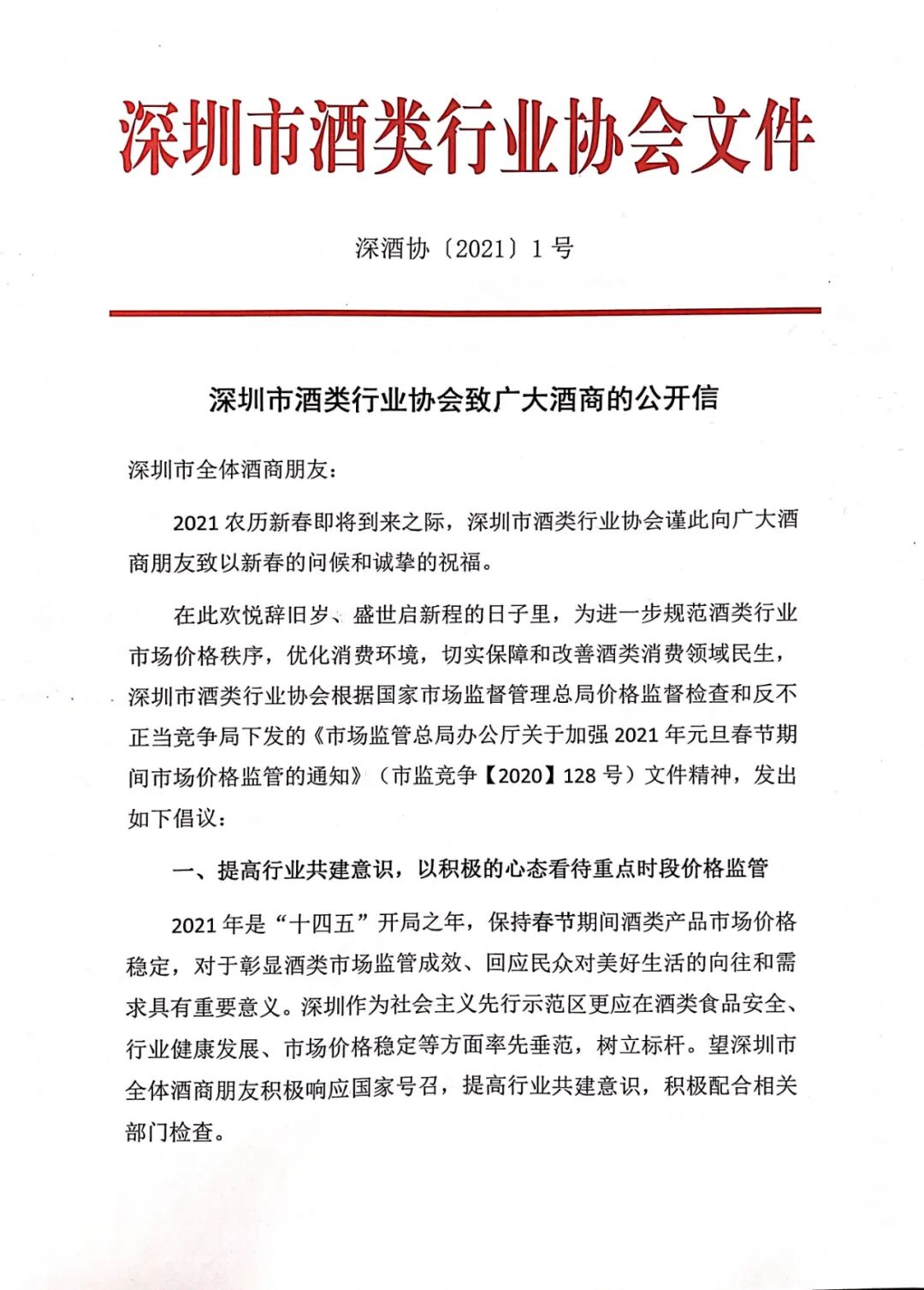 深圳市酒类行业协会致广大酒商的公开信 深圳市全体酒商朋友:2021农历新春即将到...