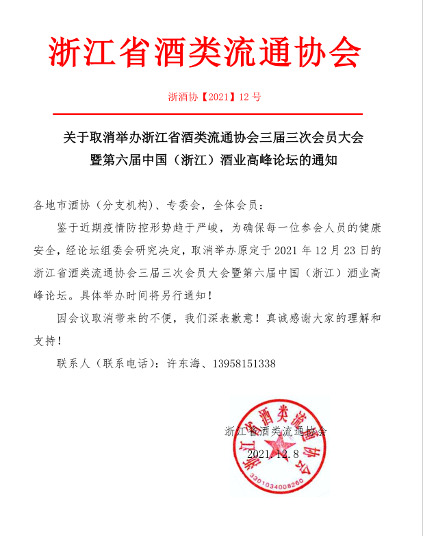 2024.03.15 19:06重要通知:关于取消举办浙江省酒类流通协会三届三次会员大会暨第六届中国(浙江)酒业高峰论坛的通知