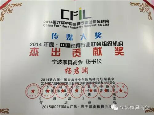 2015年2月商会执行会长兼秘书长杨君渊,荣获由2014第六届中国家具行业创...
