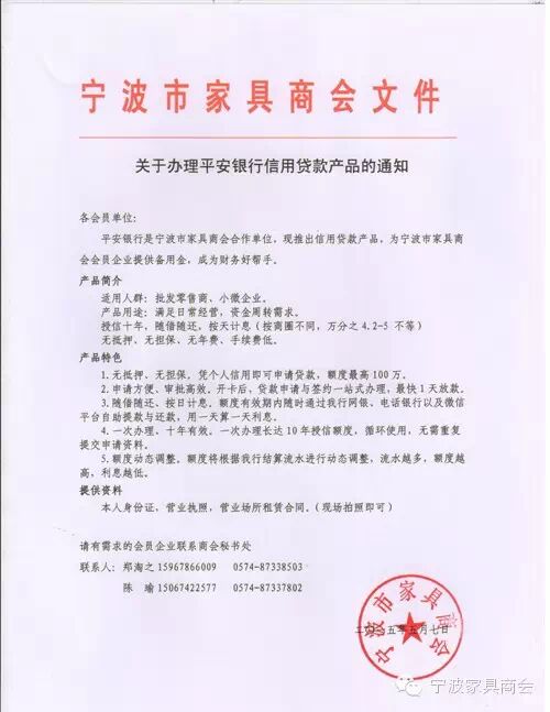 各会员单位:平安银行是宁波市家具商会合作单位,现推出信用贷款产品,为宁波市家具商...