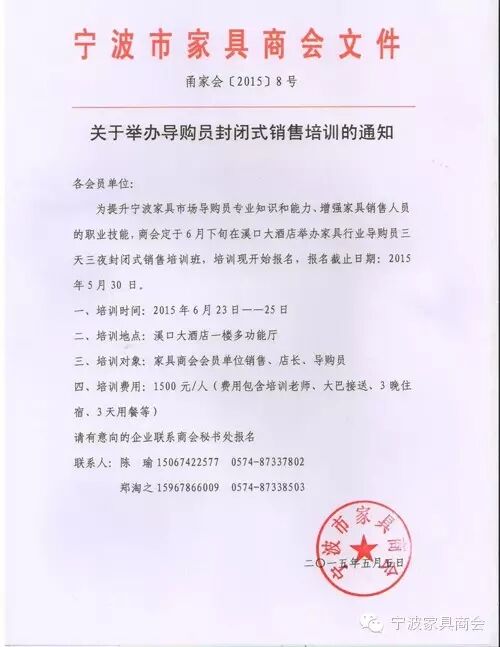各会员单位:为提升宁波家具市场导购员专业知识和能力、增强家具销售人员的职业技能,...
