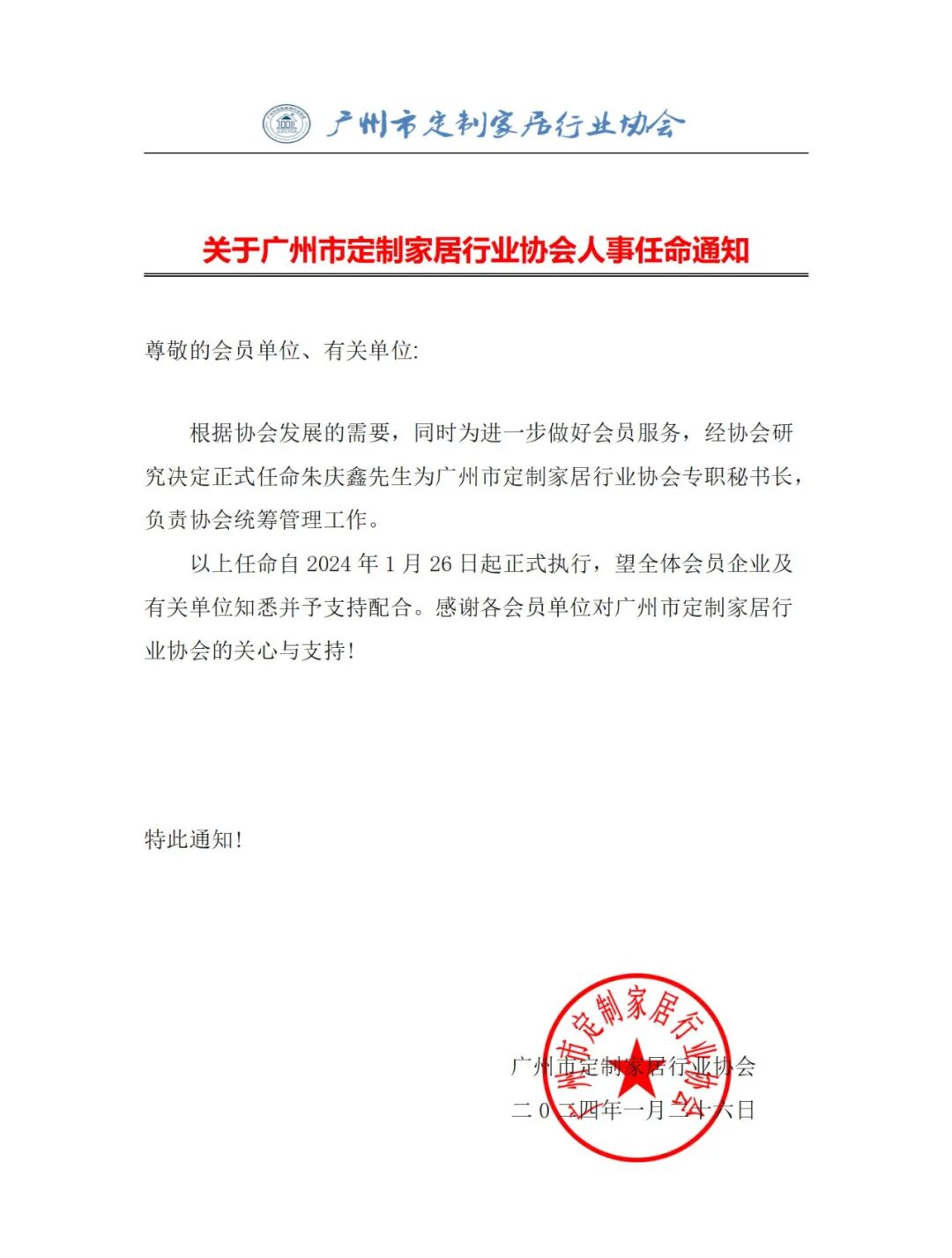 2024.03.18 14:30关于广州市定制家居行业协会人事任命通知