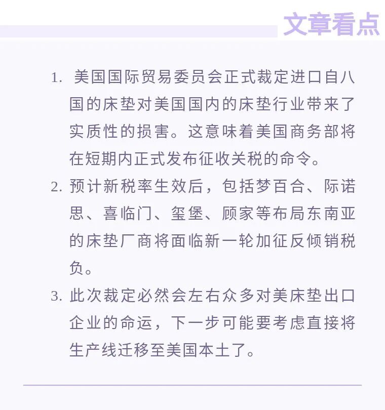 【公平贸易】美国商务部将正式发布征税命令!中国、越南等八国床垫出口受重大打击!