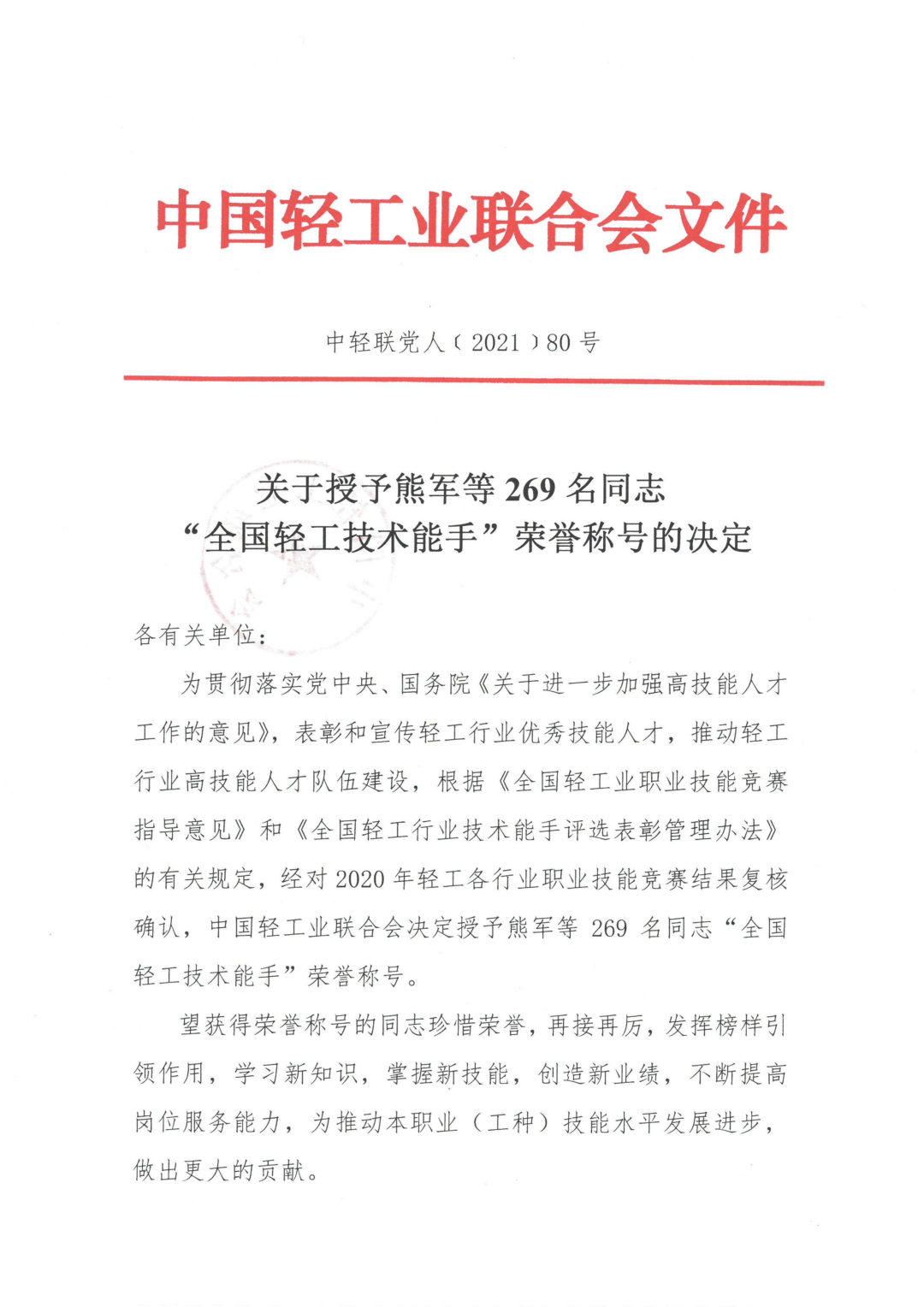 【技能竞赛】新会赛区三名选手被授予“全国轻工技术能手”荣誉称号