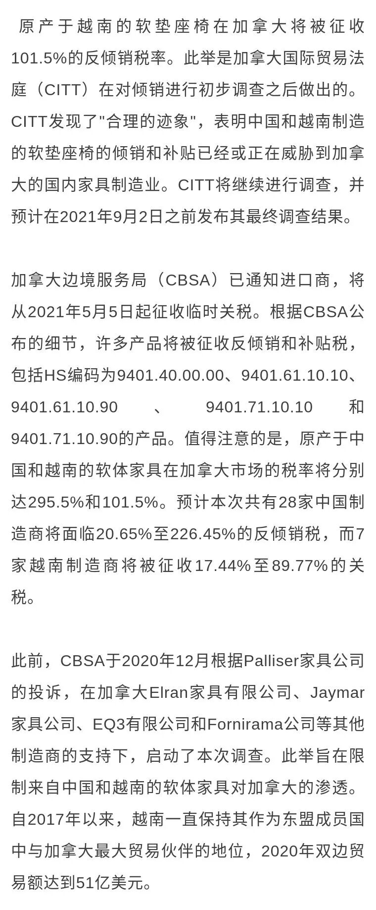 2024.03.19 13:42【公平贸易】加拿大将对中国软垫座椅征收高额关税