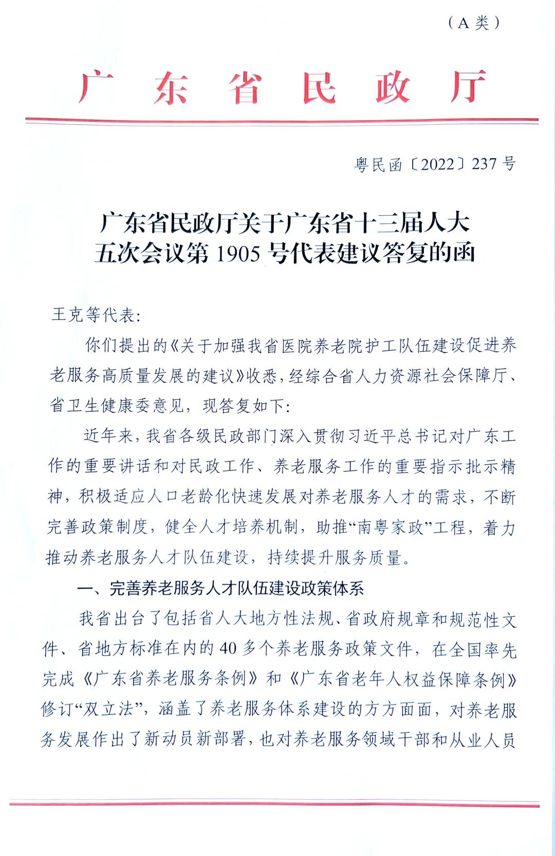 【人大工作】广东省民政厅书面答复王克代表有关加强我省医院养老院护工队伍建设的建议
