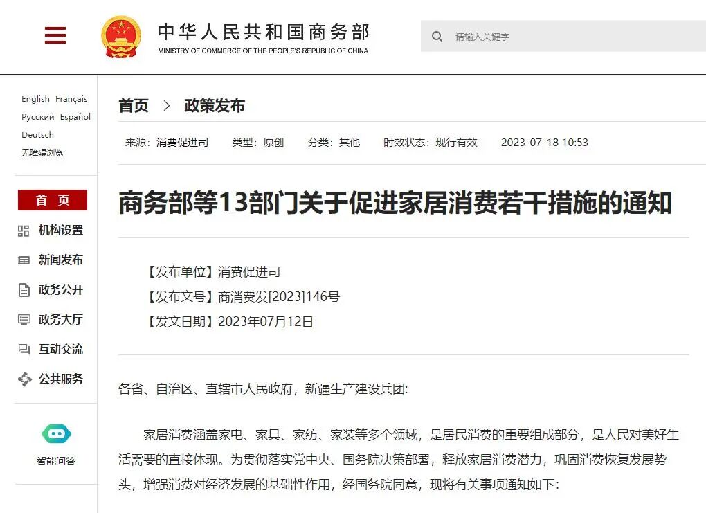 7月18日消息,日前,商务部、国家发展改革委等13部门联合发布《关于促进家居消费...