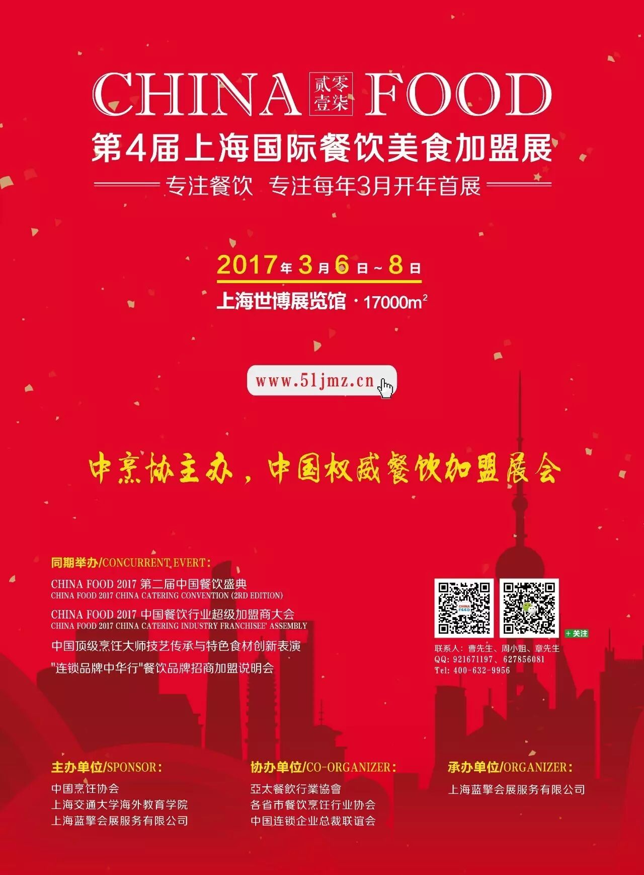 餐饮界的小伙伴们,2017上海国际餐饮美食加盟展即将登陆上海滩!!!↓↓↓展会时间:2017 年 3 月 6 ~ 8 日举办地:上