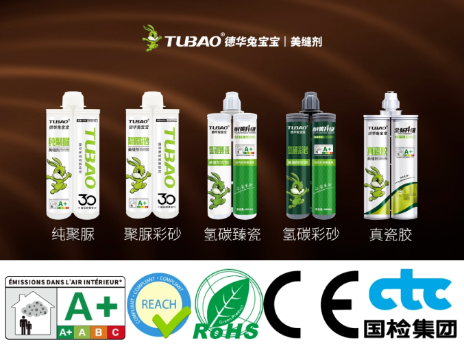兔宝宝正式推出五款美缝剂系列产品,分别有纯聚脲美缝剂、聚脲彩砂、氢碳臻瓷、氢碳彩砂、真瓷胶。