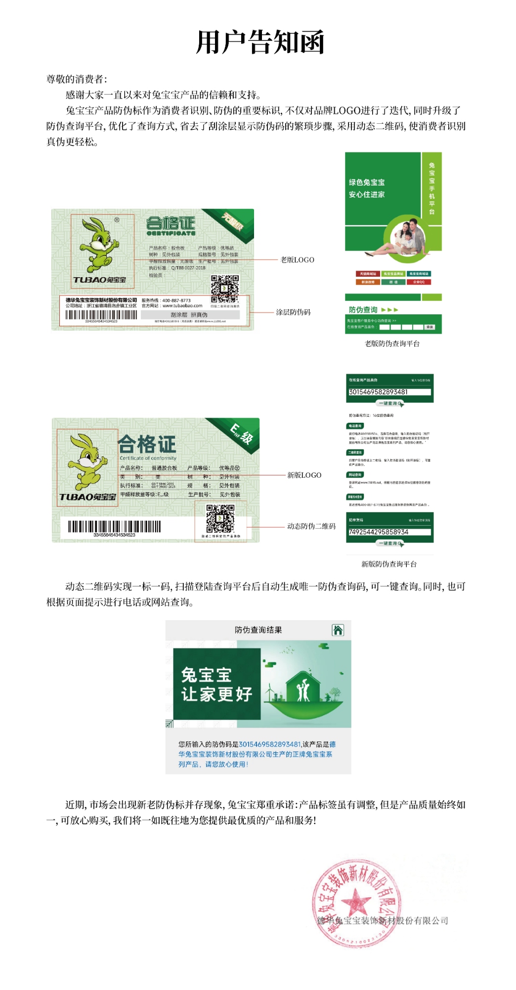关于兔宝宝板材防伪标升级的告知函