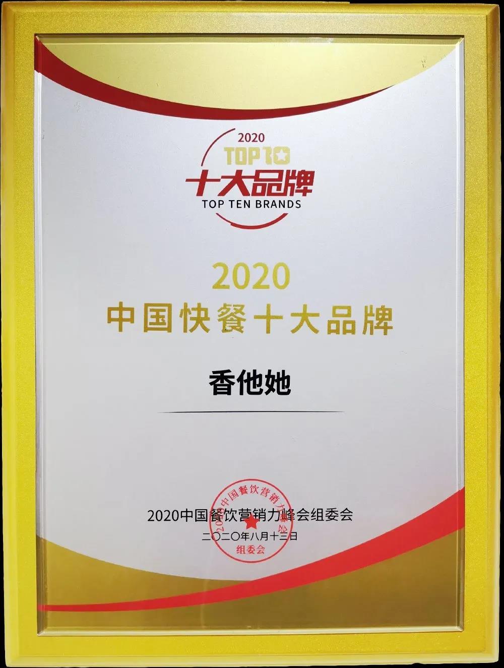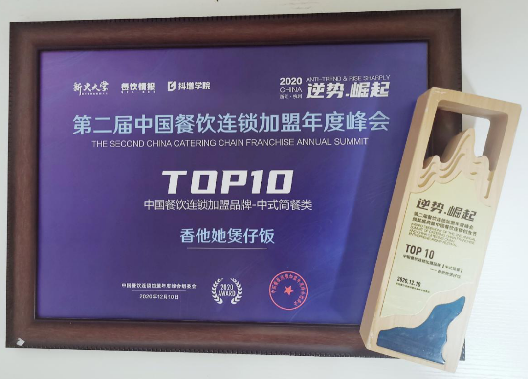再获殊荣,香他她斩获2020年十大中式简餐连锁加盟品牌