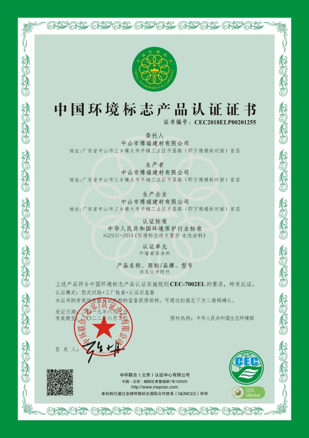 卡西米爱丁堡仿石漆荣获“中国环境标志产品认证证书”